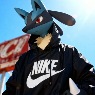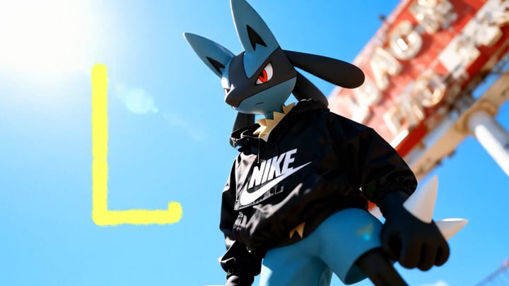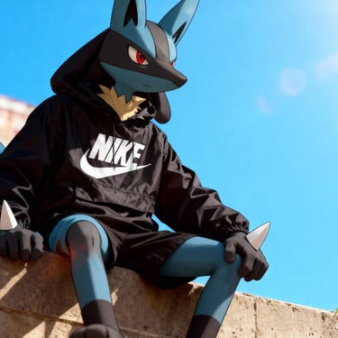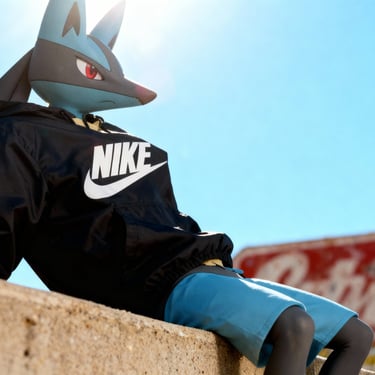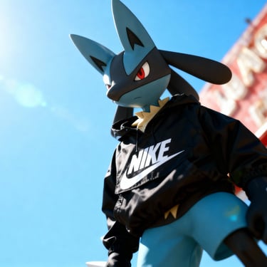 Lucario rolls in wearing Nike and the street bristles: wet asphalt, low-angle shots, cuts on the beat. Clean silhouette, rugged attitude; every frame bites without asking. High-octane editorial made with AI. Unofficial creative piece.