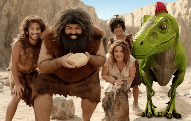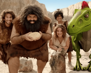 Spots donde lo moderno se vende en plena prehistoria: cuevas con luz de estudio, tipografías “talladas” y gags que rugen en 12s.